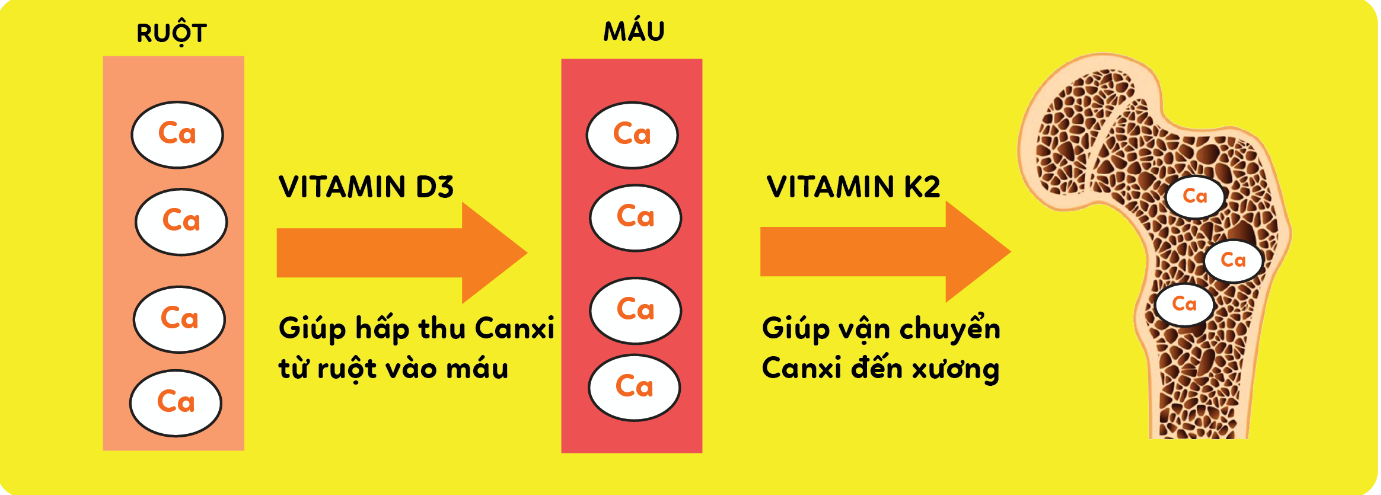 Canxi từ chế độ ăn uống làm thay đổi quá trình sản xuất hormone theo cách có lợi cho xương của bạn. Vitamin D cùng vitamin K2 chuyển hóa canxi, cải thiện sức khỏe của xương.